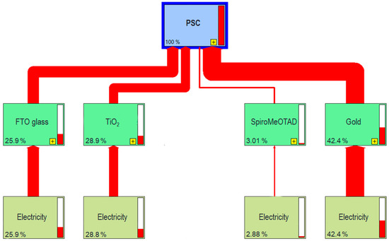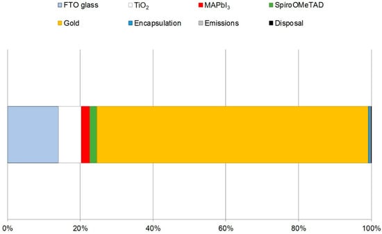 Calculating the burden of the direct electricity consumption during the manufacturing processes of the G1 configuration with the CED method, the most energy-intensive processes are the FTO glass substrate preparation, the TiO2 electron layer deposition, and the gold back contact deposition (Figure 7).