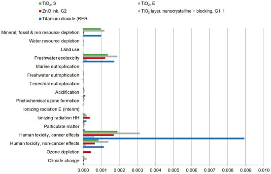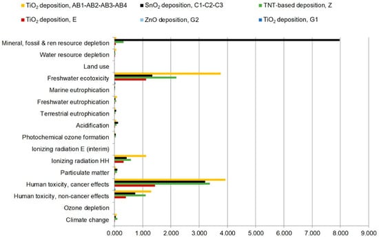 The calculation of the environmental profiles of the different ETL deposition processes reported in the selected LCA studies is shown in Figure 9.