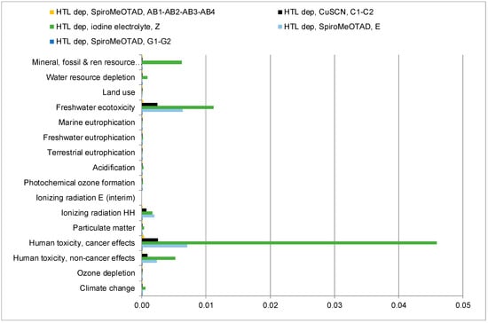 The results reported in Figure 12 allow the assessment of the major contributions to the environmental profiles of the hole transport layer (HTL) deposition methods. The comparison among HTL depositions described in the selected LCA studies again shows that the impact obtained for the S configuration of [] overwhelms the other processes due to the high energy consumption (see Table S5 in SI). Thus, their environmental profiles are not included in Figure 12.