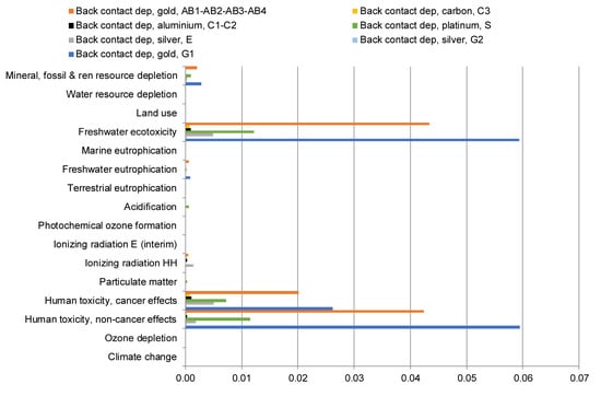 Despite the PSC configuration containing gold, the employment of Pt in the back contact of the Z configuration reported by Zhang et al. [], the use of silver in the G2 configuration described by Gong et al., and the energy consumption of the other back contact deposition processes exhibits a considerable contribution on the environmental profiles.