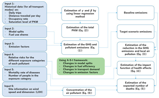 The methodology developed in this study introduces a quantitative analysis modeling framework for the simplified representation of the transport sector with an institutional evaluation to evaluate not just the magnitude of emission reductions from local air pollution and carbon emissions but also to determine benefits from improving the air quality and its impact on public health. It uses the A-S-I (Avoid-Shift-Improve) approach which set the standard for low carbon transport modeling and covers the city-wide transport system, thus impacts of multiple of transport choices can be assessed (see Figure 1). The A-S-I approach is a bottom-up framework which can be used as a scenario planning tool in assessing the co-benefits of climate policies in the transport sector [36,37]. Here, the co-benefits refer to the reduced local air pollution and improved public health, which can result from the GHG emission reductions, simultaneously [38]. The A-S-I helps to determine the right action plans and policy interventions in achieving a sustainable urban transport system [39].