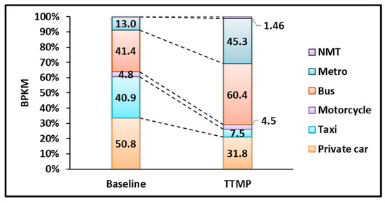 Comparison of transport mode shares between the baseline scenario and the TTMP in 2030.