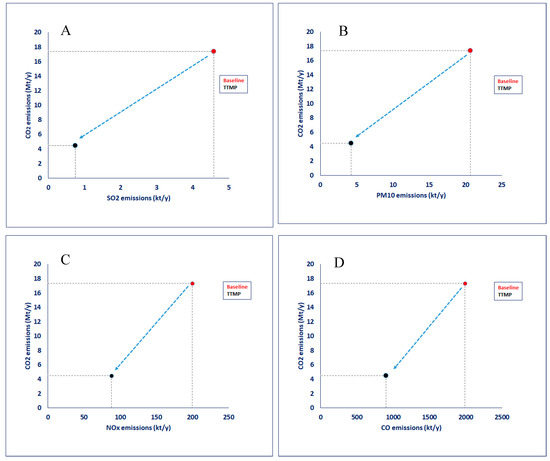 Expected reduction in CO2 emissions and air pollution from the TTMP in 2030 (A: CO2 Vs. SO2; B: CO2 Vs. PM10; C: CO2 Vs. NOx and D: CO2 Vs. CO).