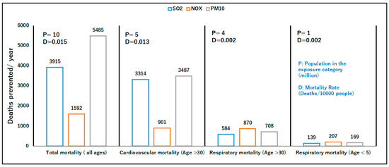 where Dj, Pj, and refer to the mortality rate of disease (i.e., deaths/10,000 people), the share of the population in the exposure category, and the concentration of pollutant, respectively. The concentration of each pollutant () can be calculated by using the following formula: