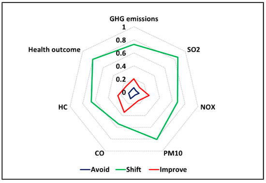 To compare the expected co-benefits across different A-S-I actions, the results were normalized on a scale of zero to one, using the min-max calculation method. Figure 10 shows the aggregate scores for each action group in the TTMP. The shift actions perform well in all expected co-benefits in the transport sector, followed by the Improve action, which is linked with upgrading fuel-economy in the passenger car fleet. The expected co-benefits from preventing unauthorized entry of passenger vehicles in the RTZ and developing the NMT (Avoid actions) are expected to be achieved from the reduction in NOx emission in Tehran’s transport sector.
