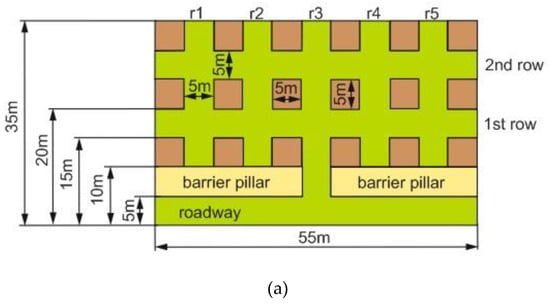 Room and pillar mining methods are used in ore mines and also in coal and chemical resources mines [18,19]. Pillars of various shapes and cross-sections (continuous, square, round, rectangular) are placed between rooms. They are meant to ensure the stability of the post-excavation area (the field or its part). For new fields of exploitations, in which the room and pillar method will be used, monitoring systems of the rock bolt support are designed to optimize the bolting technological parameters [20]. Room and pillar mining methods are dedicated to horizontally or slightly inclined orebodies. For example, in some underground copper mines, at the first stage of this technology, several usually parallel rooms are driven to extract the minerals with drilling and blasting method using explosives. In the same way, as the second phase of the technology, similar perpendicular excavations are constructed. Finally, between the intersecting excavations, some parts of the orebodies are left in their original location, forming pillars [21]. Their role is to support overlying rocks and secure their stability and work safety for miners. Usually, the pillars are insufficient from a stability point of view, and therefore, additional reinforcement is applied using rock bolting as the most effective way. The room and pillar mining method is a very effective and one that enables a high level of mechanization of the technology. The uncovered roof area increases with the progress of orebody excavation, and the pillars sustain an increasing value of loads from the rock mass. For the adopted system geometry, the opening width of the working area and the correct selection of pillar and room dimensions are vital to ensure safe operating conditions with minimum losses of the mineral being mined [22]. Under complex geological and mining conditions, the distribution of stresses in individual pillars, as well as in the mining field, is difficult to accurately predict. This makes it necessary to adopt certain simplifying assumptions. Methods in which pillars between rooms work with the rock mass as the main independent construction elements to bear the loads from their designated rock columns are common in engineering calculations [23]. There are also methods in which the load-bearing structure comprises pillars between rooms and a compact layer of roof rocks, which absorb the load from the remaining layer of the overlying rocks. In addition to this, the pillars between rooms can absorb the load of the unloaded part of the roof, while cooperating with the overlying layer of compact rock (main roof) in transferring the loads of the overlying overburden layers [24].