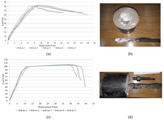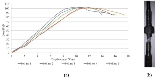 Segmentally installed glue-in roof bolting was subjected to tensile tests using a universal testing machine in the bolt laboratory of the Department of Underground Mining. Five bolts were tested for each hole diameter. The laboratory test stand (Figure 13a,b) is equipped with a QUANTUM MX840A measurement amplifier (HBM, Spectris plc, Darmstadt, Germany), to which force and displacement sensors are connected [29]. The load increment speed was 0.5 kN/s. The amplifier is connected to a computer with Catman–Easy software installed, which allows live tracking of the load and displacement properties. Tensile strength test results for glue-in Olkusz-16A roof bolting installed along 0.1 m and 0.2 m sections for hole diameters 0.028 m, 0.032 m, 0.035 m, and 0.037 m are presented in Figure 14a–h, Figure 15a–h and Table 1.