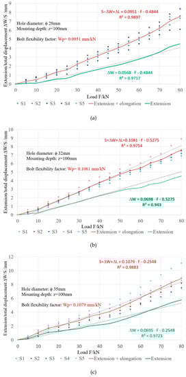 Using Equation (6) to calculate bolt elongation ΔL, based on Equation (4) and the measured total displacement value S, we can calculate the value of the bolt’s extension from the hole ΔW. Figure 16a–d and Figure 17a–d illustrate the test and calculation results. Performing a linear approximation of the experimental data in Table 2 and Table 3, we obtained the following relationships: