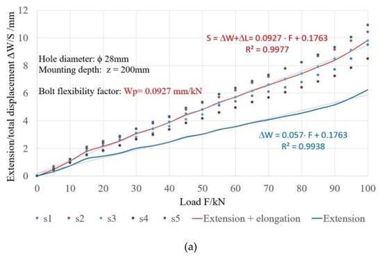 Slope Wp in Equation (7) is a bolt’s flexibility factor expressed by the ratio of the value of displacement increase to the value of axial tension increase (Figure 16a–d and Figure 17a–d).