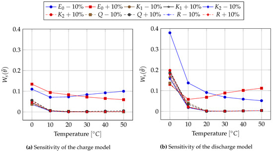 The models were simulated in Matlab using the model equations (Equations (1)–(6)). At each temperature, the nominal parameters were perturbed one-by-one and the value of the loss function was computed. The result of the sensitivity analysis of the charge and the discharge model can be seen in Table 2 and Table 3. The graphical representation of the results is depicted in Figure 2.