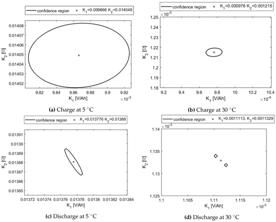 The confidence region of the estimated parameters can be approximated by the 1.05 contour line of the cost function W. To analyze and illustrate the confidence regions, we analyzed the parameters in pairs. We fixed two parameters and computed the value of the cost function when changing the other two parameter values around their estimated value. The two parameters pairs were chosen as and . Some examples of the confidence regions in the case of charge/discharge at different temperatures are illustrated on Figure 3 and Figure 4. The order of magnitude on the x and y axes are the same in Figure 3a–d and Figure 4a–c respectively. In Figure 4d, the axes are magnified for better visibility. Comparing the confidence regions at different temperatures and operating modes, the following conclusions can be drawn: