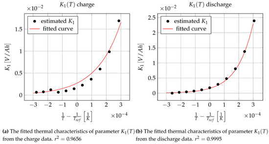 It can be seen that the estimated temperature dependency of and Q is close to the nominal values in both charge and discharge cases. The estimation of and is better in the case of charge because the differences between the nominal and estimated parameter are smaller. However, the estimation of the other parameters is better in the case of discharge.
