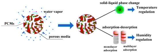 A schematic diagram of CTHCM is shown in Figure 2. In this study, CTHCM is assumed to be a composite temperature and humidity control material synthesized by taking PCMs (such as paraffin) as the temperature-regulating element and porous media (such as silica gel) as the humidity-regulating element. Due to the temperature-regulating characteristic of the PCMs and the humidity-regulating characteristic of the porous media, heat and mass transfer occurs simultaneously in CTHCM. Several assumptions are listed below, in order to simplify the establishment of the numerical model in this study.