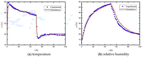 No related experimental research can be used for the validation of the performance of CTHCM proposed in this study, since the concept of CTHCM is a novel one. Fortunately, the preparation and performance testing of CTHCM has been prepared. The further plan is to carry out an experimental study of CTHCM. In addition, the proposed model in this study can also be verified by using any hygroscopic materials. The reason is that the governing equations of CTHCM are the same as those of hygroscopic materials due to the utilization of effective thermal capacity method for PCMs in the simulation model. The only difference between them is the material property, which has no influence on the verification of the model. The established model has been verified by relevant experimental data from the literature [35,36]. The geometric model for validation has been built in the same way as the experimental setup from the literature. The initial and boundary conditions, and the thermodynamic properties of the material have been changed to be the same in the literature. Figure 3 shows the comparisons of the temperature and relative humidity between simulated data and experimental data during the adsorption and desorption tests. It could be concluded that the simulated data fitted the experimental data very well. As a result, the numerical model could be used for further case studies.