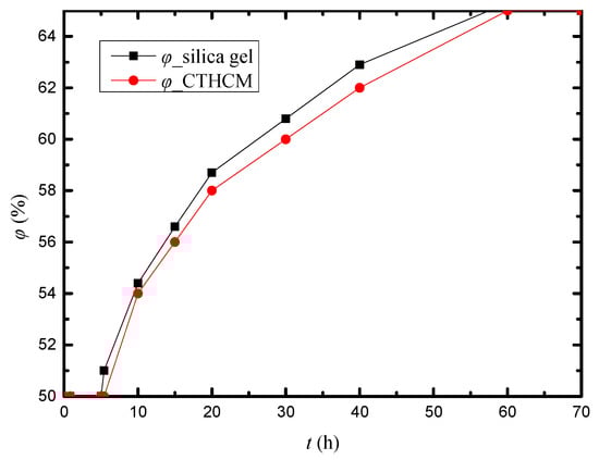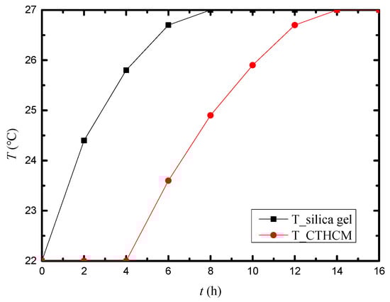 Figure 4 and Figure 5 shows the temperature and relative humidity of CTHCM and silica gel with time growing under initial conditions. The monitoring point is located in the middle of CTHCM and silica gel. It can be observed that the temperature of CTHCM increases more slowly than that of silica gel over time. It can be seen that the temperature-regulating performance of CTHCM is higher than silica gel, which is because the temperature-regulating effect of CTHCM is a combination of sensible heat transfer and latent heat transfer, PCMs inside the pore of silica gel increase the temperature-regulating performance of CTHCM. In addition, it can be concluded that no distinct difference occurs between the relative humidity changes of both CTHCM and silica gel over time. As a result, PCMs inside the pore of silica gel will not affect the humidity-regulating performance of CTHCM. As the aim of such materials is to passively regulate the temperature and relative humidity of display cases in museums, and the advantage of CTHCM is more significant in temperature-regulating, it can be expected that CTHCM can obtain a better and more precise hygrothermal control effect than conventional silica gel.