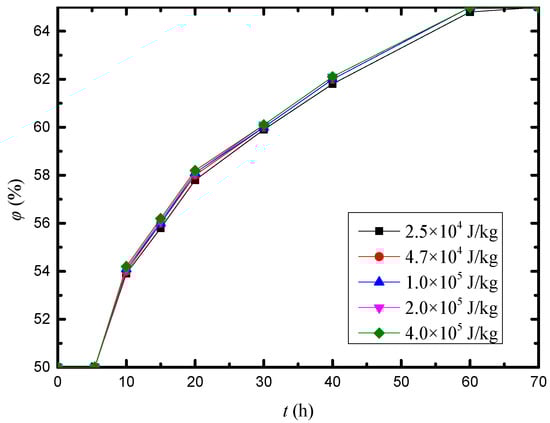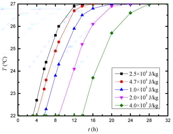 Influence of the phase change latent heat on the temperature-regulating and humidity-regulating performance of CTHCM are described as shown in Figure 6 and Figure 7, respectively. It can be found that the temperature change rate decreases with the increasing of hm. This means that the transient heat capacity increases. When hm increases from 2.5 × 104 J/kg to 4 × 105 J/kg, the time which is needed for the temperature to increase from 22 ℃ to 27 ℃ is extended from about 12 h to 28 h. That is to say, a larger hm is helpful to absorb more thermal energy. This can be explained by the fact that more latent heat capacity can be included in CTHCM with larger hm, which results in the improvement of temperature-regulating performance. On the other hand, for the relative humidity, no obvious difference can be found with an increasing hm. Therefore, the phase change latent heat hm has no influence on the humidity-regulating performance of CTHCM. In sum, a larger hm can improve the temperature-regulating performance of CTHCM as well as having no side-effect on the humidity-regulating performance.