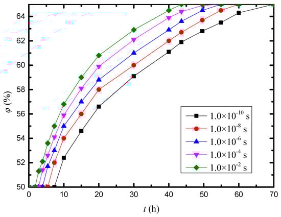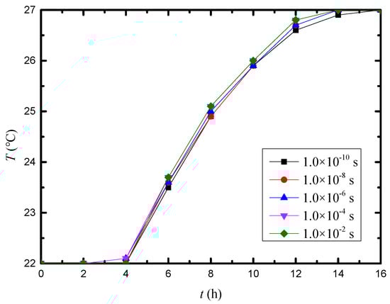 The influence of water vapor permeability on the temperature-regulating and humidity-regulating performance of CTHCM is described as shown in Figure 8 and Figure 9, respectively. It can be concluded that the relative humidity change rate increases with an increasing δv. When δv increases from 1 × 10−10 s to 1 × 10−2 s, the time which is needed for the relative humidity to increase from 50% to 65% is decreased from about 70 h to 43.6 h. This is mainly due to the enhancement of mass transfer rate with increasing δv. Moreover, little temperature different fluctuation can be observed with increasing δv. That is to say the water vapor permeability δv has no influence on the temperature-regulating performance of CTHCM. In conclusion, larger δv is able to improve the humidity-regulating performance of CTHCM without affecting the temperature-regulating performance of CTHCM.