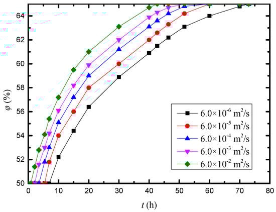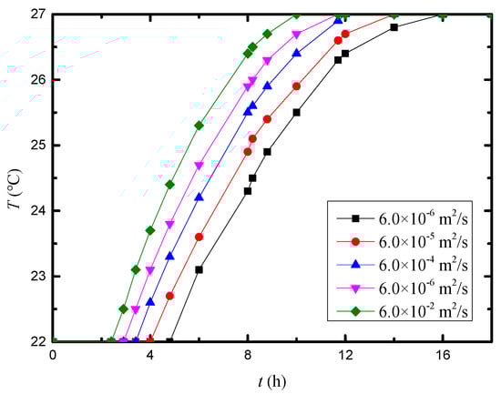 The temperature and relative humidity of CTHCM with respect to different values of Dw are simulated as illustrated in Figure 10 and Figure 11. For the relative humidity, it is found that CTHCM with larger Dw has a better humidity-regulating ability over time. For example, when Dw increases from 6 × 10−6 m2/s to 6 × 10−2 m2/s, the time which is needed for the relative humidity to increase from 50% to 65% is contracted from about 73 h to 42.7 h. The results show that with the increasing Dw, the liquid water permeability δl is also increased, which results in more moisture removal. For the temperature, it can be found that the temperature experiences different increases at a certain time as Dw increases, which indicates more heat is released during the heat transfer process when there is a larger Dw. This is mainly due to the liquefaction of more water vapor as the liquid water permeability increases. When Dw increases from 6 × 10−6 m2/s to 6 × 10−2 m2/s, the time which is needed for the temperature to increase from 22 °C to 27 °C is contracted from about 16 h to 10 h. As a result, under this specific condition, increasing Dw can improve the moisture capacity of CTHCM. However, the temperature-regulating ability is prone to be reduced due to the liquefaction of water vapor with an increasing Dw, therefore a tradeoff should be made between the temperature-regulating performance and humidity-regulating performance of CTHCM.