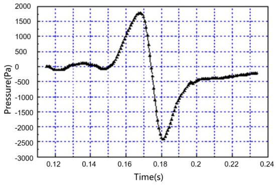 t = 0.20016 s, respectively. It can be seen that when passing through the head of the train, a high-pressure area is formed at the corresponding position on the side of the train, followed by a low-pressure area. The high-pressure area and the low-pressure area move forward at the same speed as the train passing through. Thus, the pressure fluctuation caused by the train crossing can be measured at every point on the lateral side of the train.
