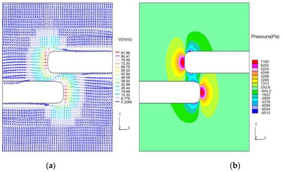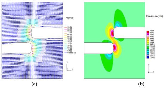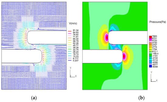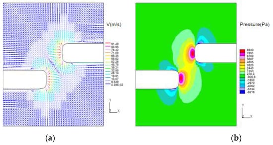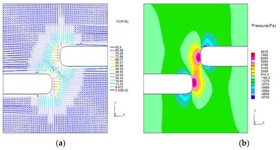 Velocity and Pressure Distribution at t = 0.18072 s: (a) velocity distribution; (b) pressure distribution.
