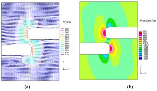Velocity and pressure distribution at t = 0.1656 s: (a) velocity distribution; (b) pressure distribution.