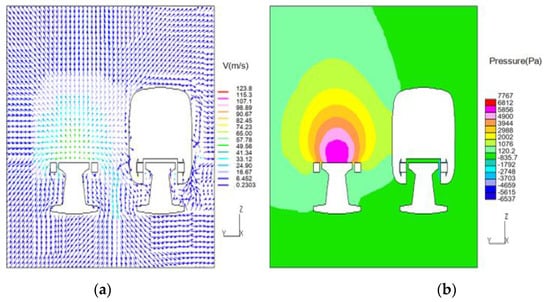 Velocity and pressure distribution at t = 0.1368 s: (a) velocity distribution; (b) pressure distribution.