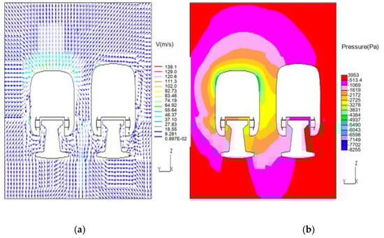 Velocity and pressure distribution at t = 0.1440 s: (a) velocity distribution; (b) pressure distribution.