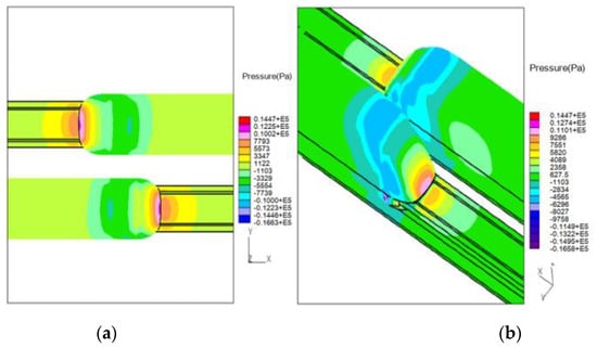 Pressure variation on train surface during crossing at t = 0.20016 s: (a) top view; (b) left view.