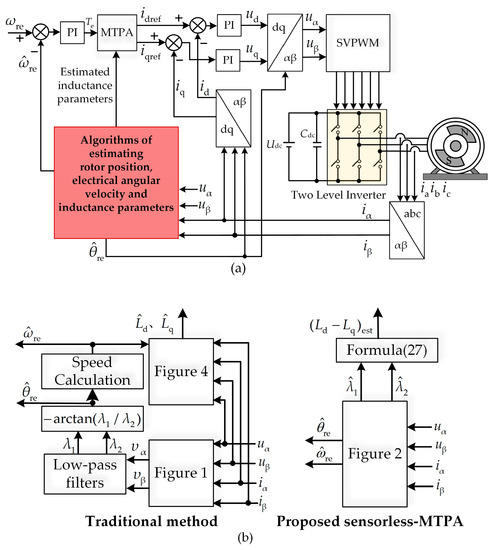 - Different from the traditional method to achieve the MTPA control when the position sensor of the IPMSM is absent, a sensorless-MTPA control scheme is proposed by analyzing the principle of the MTPA control. In the proposed method, the designed ASMO not only observes the rotor position and speed but also relies on the difference between d-axis and q-axis inductances to obtain the MTPA points directly so that the MTPA control can be achieved simultaneously without adding an observer.