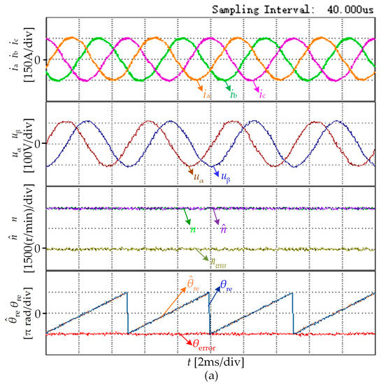 Figure 8 shows the experimental waveforms of acceleration with the proposed algorithm. Firstly, the motor operates at 1000 r/min stably with the rated load, and then, the speed of the motor is accelerated to 3000 r/min within 1.2 s. The experimental waveforms in Figure 8a are the three-phase currents ia, ib, ic, the input voltages of the ASMO d , actual speed n(r/min) and estimated speed (r/min), actual rotor position and estimated rotor position from top to bottom. Figure 8b is the enlarged waveforms in Figure 8a.