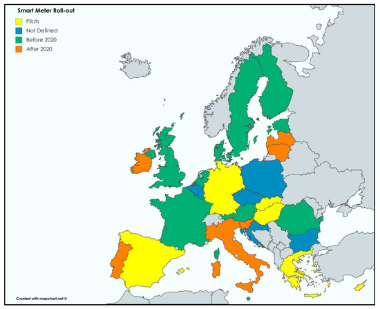 Four main stages of the roll-out of smart meters were identified through the analysis of the 2017 National Energy Efficiency Action Plans [16,17] and the National Energy and Climate Plans [18]. They are represented in Figure 1 below, as: