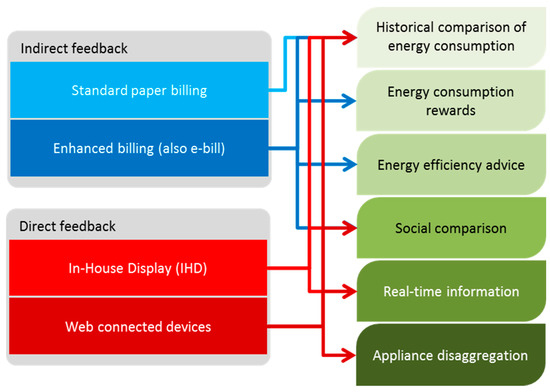 According to McCalley [21], feedback can be defined as “the mechanism that directs attention to a specific goal” and two main families of feedback may be adopted: indirect and direct. It is possible to classify other sub-categories, under these two broader categories, that allow different ways of interaction and reaction from the energy providers and final energy consumers. Figure 2 proposes a classification of feedback systems in relation to the type of information that they can provide.