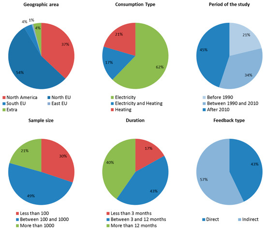 By taking into account a total of 64 studies [30,31,32,33,34,35,36,37,38,39,40,41,42,43,44,45,46,47,48,49,50,51,52,53,54,55,56,57,58,59,60,61,62,63,64,65,66,67,68,69,70,71,72,73,74,75,76,77,78,79,80,81,82,83,84,85,86,87,88,89,90,91,92,93], a final database including 127 implementations of a certain type of feedback was collected, and for 114 of these, the percentage of energy savings was clearly reported. Overall, they cover: