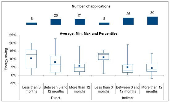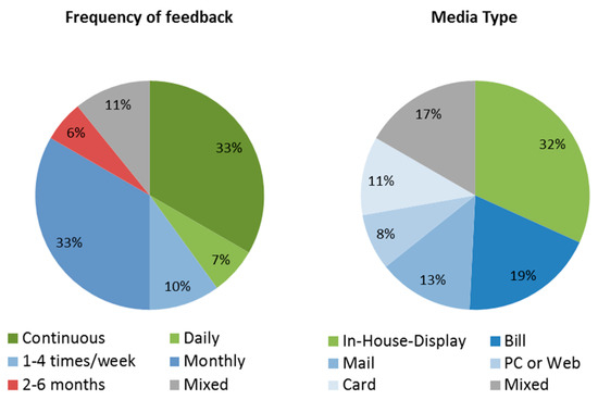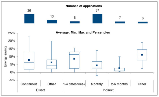 As theory suggests [27,94], a more frequent feedback should be more effective than the occasional one because it helps to connect a behavioral change to its effect on energy consumptions. This is verified looking at the Figure 8. Especially for indirect feedback, the mean savings is clearly proportional to the frequency, passing from 8.6% with 1–4 feedback per week to 2.7% with the most infrequent communications (every 2–6 months). The absolute maximum saving was obtained with continuous direct feedback. In line with previous experiences, the immediate feedback (the consumer is able to refer to the feedback directly after taking action) is particularly effective during the learning phase, when the user’s attention is focused on the specific action target.