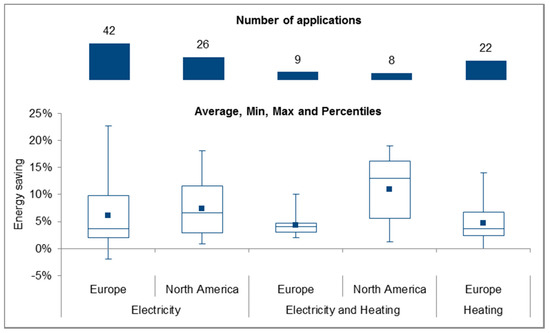 Looking at the average energy savings, they fall in the interval 4%–11% and they are slightly higher in North America. The standard deviations are always greater than 2% and reach the value of 6.5% for feedback on electricity only in Europe and on electricity and heating in North America.
