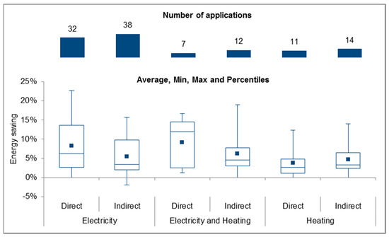 In general, it is confirmed that a higher average savings is related to a direct feedback with respect to an indirect one, when the recorded outputs are grouped per type of end-use and feedback (Figure 5). However, these results are true when the feedback is provided only on electricity consumption (8.3% against 5.4%) and on both the end-uses (9.1% against 6.2%), but not for only heating consumptions. In this case both the average (4.6% against 4.0%) and the maximum (14.0% against 12.3%) savings are associated to indirect strategies.