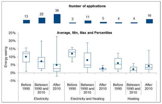 As shown in Figure 6, the average savings associated with feedback systems depends on when the experiment was carried out. As the common sense would suggest, the effectiveness of feedback can be inversely related to the grade of awareness of energy consumers: i.e., the feedback would be less effective when the starting behavior of the building occupants is high aware. Supposing that the general awareness is growing over the time because of many factors (i.e., development of information campaigns, increase of energy prices, effects of climate changes, etc.), this may clarify why the average savings observed before 1990 (9.4% in average) is greater than that recorded after 2010 (4.0% in average) for all end-use types. Another reason for this is the past increase of energy efficiency of domestic appliances and heating systems.