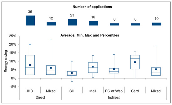 Regarding the type of media (Figure 7), this cross-analysis discloses that greater savings can be reached with a real-time feedback provided by an in-home display or a web tool (7.8% on average) and that the indirect feedbacks communicated with a card (i.e., door hanger or other card/sign delivered by the researchers to the energy consumers) are more effective (9.4% on average) than those delivered by other mediums (not considering mixed modes). The indirect systems based on bills are definitely more replicable and can be extended to higher samples (due to their lower specific costs), but their impact appears smaller (3% on average and 10% maximum). Some studies have been categorized as “mixed” because more than one medium was used.
