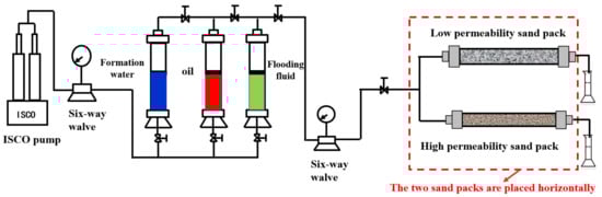 The parallel sand pack flooding tests were carried out by using two sand packs (Φ2.5 cm × 50 cm) with different permeabilities to investigate the oil recovery efficiencies of two different surfactant–polymer flooding strategies. The high and low permeability sand packs were used in combination to simulate the reservoir heterogeneity. The high and low permeability sand packs were prepared as follows [36,37]: The sand packs were positioned vertically and filled with formation brine, then fresh quartz sand with different mesh sizes were added into the sand packs and packed by vibration.