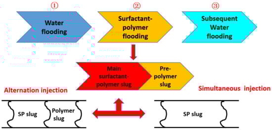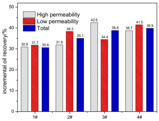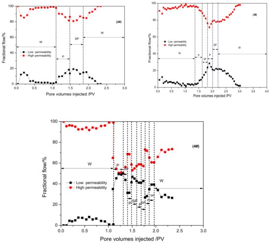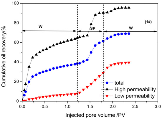 - Then, after SP flooding, as shown in Table 4 and Figure 9, the total incremental oil recovery of SP flooding under the simultaneous injection strategy was 30.6%, while that of SP flooding under the alternating injection strategy ranged from 35.06% to 39.86%. It was demonstrated that the alternation injection of polymer and surfactant-polymer (PASP) had a higher total incremental oil recovery than the simultaneous injection of the surfactant and polymer (SP). Moreover, as the alternating cycle increases, the incremental oil recovery increases. Based on the fractional flow analysis results, the alternating injection of the polymer and surfactant–polymer (PASP) showed a better sweep efficiency improvement ability than the simultaneous injection of the surfactant and polymer (SP). This indicates that more SP slugs were diverted into the low permeability sand pack. By combining the mobility control and oil displacement ability, more remaining oil in the low permeability sand pack can be recovered after water flooding.