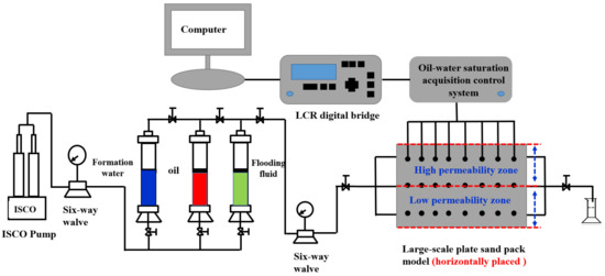 The comparison of the remaining oil distribution under different injection strategies was studied by performing flooding experiments on the plate sand pack model with a saturation acquisition device. The length, width, and depth of the plate sand pack model was 50 cm, 25 cm, and 1.8 cm, respectively. Figure 3 shows the schematic diagram of the experimental setup for the plate sand pack flooding. The experimental setup was composed of four parts: ISCO pump (Teledyne ISCO company, Lincoln, Lincoln, Nebraska, USA), sand pack model, Inductance-Capacitance-Resistance (LCR) digital bridge (Changzhou Tonghui Electronic Co., Ltd, Changzhou, China), and the oil–water saturation acquisition control system [37]. The oil–water saturation can be obtained by measuring the resistivity. Fresh quartz sand of different mesh sizes was used to prepare the heterogeneous plate sand pack to simulate the high permeability and low permeability zone in the heterogeneous reservoir. The distribution of the high permeability and low permeability zone is shown in Figure 3. The permeability of the high permeability zone was about 4.0 μm2 and the permeability of low permeability zone was about 1.0 μm2.