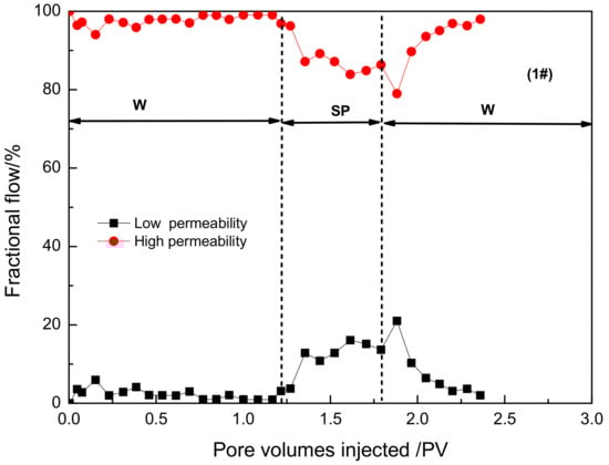 It can be seen that the changing trends of the fractional flow curve under the simultaneous injection strategy and alternation injection strategy were similar. First, due to the permeability contrast, the majority of the injection water enters into the high permeability zone, which leads to a poor water sweep efficiency. Then, at the stage of injecting the chemical slug, due to the existence of the preferred flow path of the injection water, the chemical slug can preferentially enter into the high permeability sand pack and reduce the mobility ratio of water and oil. Thus, the fractional flow of the high permeability sand pack decreases, while the factional flow of the low permeability sand pack increases. Finally, at the stage of subsequent water flooding, the subsequent injection water will break through the chemical slug gradually, resulting in increasing the fractional flow of the high permeability sand pack and decreasing the fractional flow of the low permeability sand pack. However, there are significant differences in the level of decreasing and increasing degree.