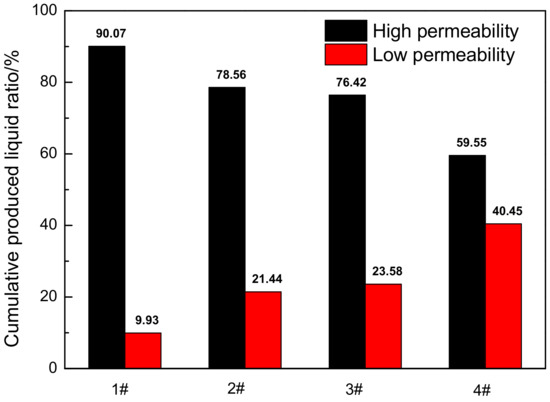Moreover, there exists an obvious difference in the relative cumulative liquid intake volume of the high and low permeability layer. Thus, to characterize the difference in liquid intake volume, the relative liquid intake capacity was proposed. To further clarify the differences quantitatively, the cumulative liquid intake ratios of the high and low permeability layers were proposed, which represent the water intake ability. Thus, on the basis of the fractional flow curves, the cumulative produced liquid ratios of the high and low permeability sand packs during the periods of chemical slug injection and subsequent water flooding were calculated, which can contribute to analyzing the water intake ability for different layers with a permeability contrast. The cumulative produced liquid ratio of the high or low permeability sand pack is defined as the cumulative produced liquid of the high or low permeability sand pack to the total cumulative produced liquid.
