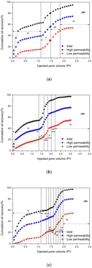 The cumulative oil recovery versus pore volumes injected under the alternating injection strategy: (a) 2#—PASP 1-cycle; (b) 3#—PASP 2-cycles; (c) 4#—PASP 4-cycles.