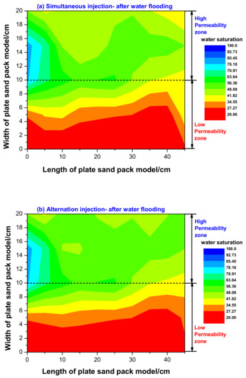 The remaining oil distribution after water flooding under alternating injection and simultaneous injection strategies is depicted in Figure 10. The remaining oil distribution of the high permeability zone and low permeability zone after water flooding was similar. It was noted that the remaining oil saturation of the high permeability zone after water flooding was obviously lower than that of the low permeability zone. Moreover, there was a main water flow channel in the high permeability zone and a large percentage of oil distributed in the high permeability zone was recovered, whereas large amounts of remaining oil distributed in the region of the low permeability zone were not recovered. The difference in the remaining oil distribution in the high and low permeability zone can be attributed to the permeability contrast. Thus, it is of vital importance to enlarge the swept area, which can recover more remaining oil trapped in the low permeability zone.
