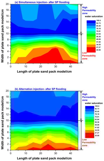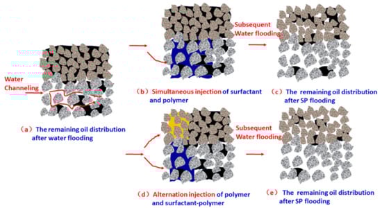 The main mechanisms governing SP flooding are enlarging the swept volume and improving the oil displacement efficiency. After water flooding in heterogeneous reservoirs, the remaining oil is mainly distributed in the low permeability zone, whereas little of the remaining oil is distributed in the high permeability zone (Figure 12a). Based on the analysis of fractional flow, incremental oil recovery, and remaining oil distribution, when the injection strategy is a simultaneous injection of the surfactant and polymer, most of the SP flooding slugs enter into the high permeability zone, as shown in Figure 12b. Although the SP flooding slug can play a role in improving the oil displacement efficiency in the high permeability zone, the remaining oil saturation in the high permeability zone is low, thus the contribution to the total oil recovery is small. Moreover, the more SP flooding slugs enter into the high permeability zone, the less SP flooding slugs enter into the low permeability zone. For less SP flooding slugs enter into the low permeability zone, the recovery of oil in the low permeability zone is low, as shown in Figure 12c.