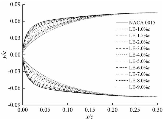 In the present study, NACA 0015 airfoil is served as the base airfoil. 10 modified airfoils are generated by changing the leading edge radius of the base airfoil from 1%c to 9%c, respectively. The characteristics of modified airfoils are listed in Table 1. Figure 1 shows the geometric profiles of the airfoils with modified leading edge.