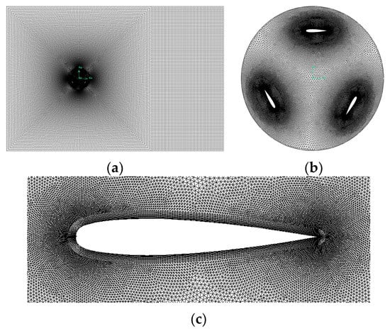It can be seen from Figure 3 that the instantaneous torque coefficient curve moves up with the increase of total number of cells. When the total number of cells is 45202, the curve deviates further with the other three curves. While the curve of mesh G3 is almost coincided with that of G4. The relative errors of the instantaneous torque coefficients and average torque coefficients between mesh G3 and G4 are smaller than 4% and 1%, respectively. Consequently, mesh G3 is selected for the following simulations. Figure 5 shows the detailed grids of the rotor designed by LE-5%c airfoil using mesh G3. The computational region is meshed by both structured and unstructured grid. For the areas around blades, unstructured grid is adopted. While for the rest of the computational region, structured grid is used. In order to capture accurate aerodynamic characteristics, mesh is refined around the blades, especially in the vicinity of leading and trailing edge.