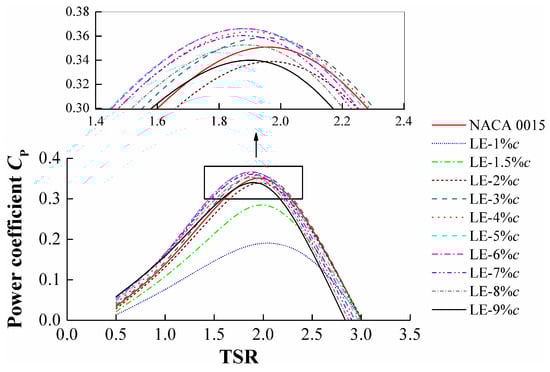 Variation of CP with respect to TSR for the rotors with different airfoil leading edge radius.