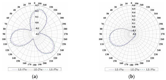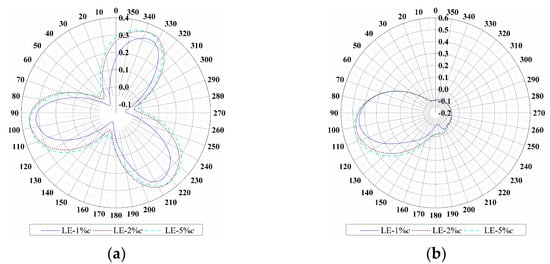 Figure 9b shows that the torque characteristics for blade 1 in the upwind region are far superior to that in the downwind side. In the most upwind region, the instantaneous torque coefficient is positive, while in the downwind region, it is negative. This is mainly due to a weakened wind speed of the latter. From the azimuth angle of 30°, with the increase of azimuth angle, the instantaneous torque coefficient grows constantly and peaks at θ = 103°. The maximum instantaneous torque coefficients for blade 1 are 0.451, 0.483, and 0.497 for the LE-1%c, LE-2%c, and LE-5%c model, respectively. It decreases until the azimuth angle reaches 180°. After that, the instantaneous torque coefficient increases slightly from the azimuth angle of 180° to 210° and decreases further until the rotational period finishes. It can be seen from Figure 9b that the differences of three curves are particularly obvious in the upwind region. The largest discrepancy of them is located at θ = 103°. While in the downwind region, the instantaneous torque coefficients for blade 1 of three profiles are almost identical. Overall, the LE-5%c model predicts the best torque characteristics for blade 1 during one rotational period at TSR = 2.0, whereas the LE-1%c model gets the worst.